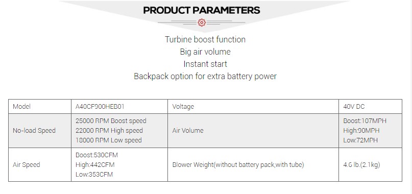 Dearadh Aeir a bharrfheabhsú: Glacann feidhm turbocharger séidire duille ceallraí litiam ardteicneolaíocht innealtóireachta ard, barrfheabhsú ar dhearadh aeir, méadaíonn sé cumhacht séideadh, agus baintear duilleoga agus smionagar.